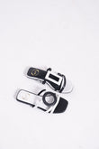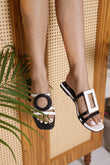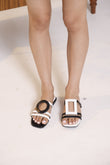 The Solace Slipper in black and white were created by popular demand, and we are completely obsessing over them. They are crafted to make a statement, with each pair showcasing and innovative asymmetrical design: one foot adorned with a striking metallic circle, the other bold rectangular cutout.