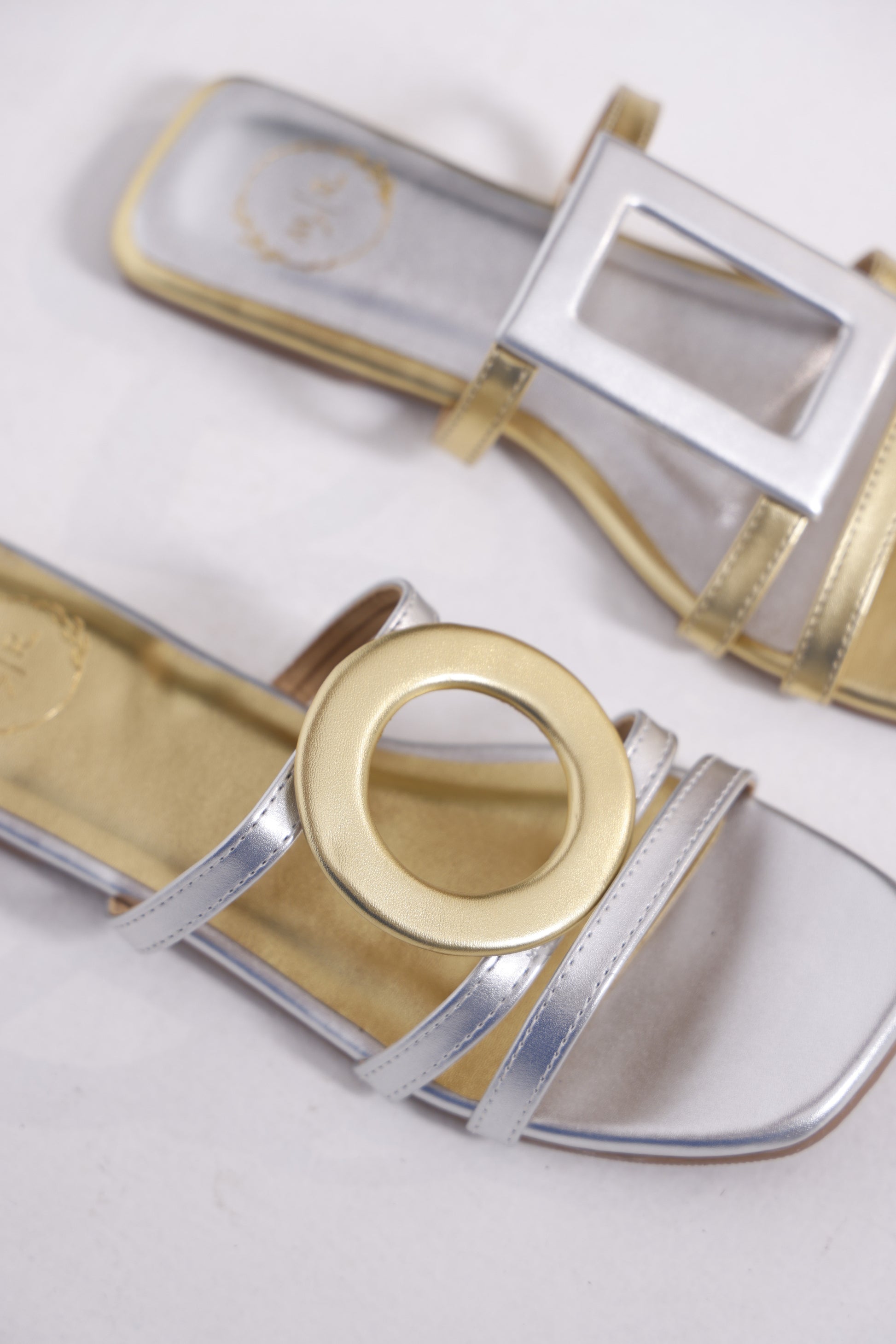 The Solace Slipper in gold and silver were created by popular demand, and we are completely obsessing over them. They are crafted to make a statement, with each pair showcasing and innovative asymmetrical design: one foot adorned with a striking metallic circle, the other bold rectangular cutout.